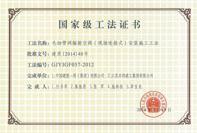 其中毛細管網輻射空調現場制作施工技術,通過科技成果鑒定委員會鑒定達到國際先進水平。