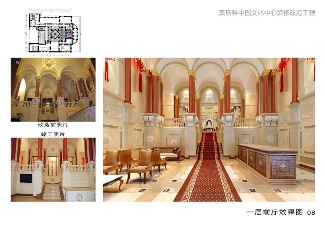 中國駐莫斯科文化中心裝修改造工程位于莫斯科白俄羅斯火車站北800米。是始建于1915年的俄式建筑,建筑面積約4000平米,二戰結束后成 為蘇聯空軍的一個俱樂部。2011年,被中國文化部購買,同年11月進行裝修改造。文化中心的外觀改造是在原有的建筑結構上,繼續延續了俄式建筑風格的厚 重、精致、細膩等特征。設計色調柔美,細節突出,品質優雅,對比強烈。色彩明亮、天然主材和古韻質樸的配飾等設計元素與原建筑結構的完美結合,溫和中塑造 亮點。毗鄰相依的中俄兩國,在漫長的歷上歲月中,經濟、文化、科學及城市建筑相互影響,相互溶合,留下了許許多多抹不去的痕跡。中國文化博大精深,愿中俄 兩國友誼源遠流長。